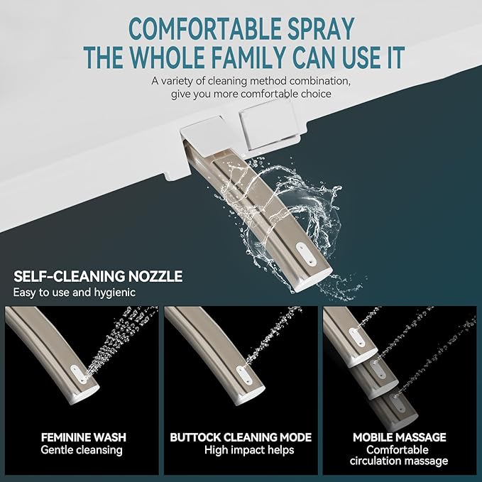 - STAINLESS STEEL NOZZLE: The electric bidet offers rear cleaning, female cleaning with adjustable nozzle position. It's also self-cleaning, and you'll never have to worry about cleaning the bathroom bidet again.