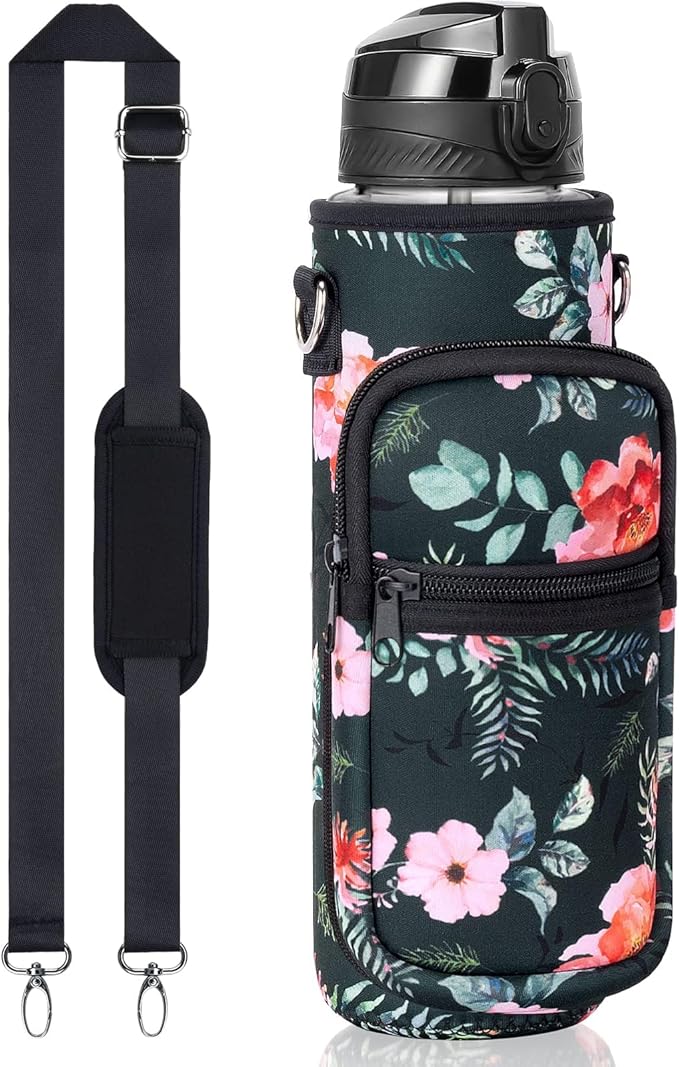 - PORTABLE STORAGE SLEEVE: 32oz water bottle is designed with high quality 5mm Neoprene sleeve, which not only can protect the water jug from slight bumps & scratch, but also keep water cold 2-3 hours(water bottle is not insulated) and avoid condensation. Water bottle sleeve with 2 zipper pockets are designed for carrying your phone, cards, airpods, keys, purse etc. Water bottle carrier with shoulder strap, which can be adjusted from 25" to 50", offers, women, men more carrying options.