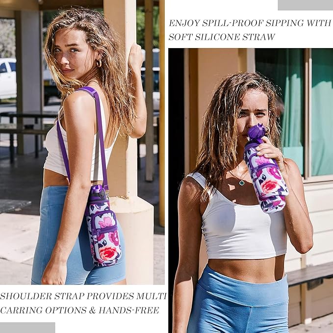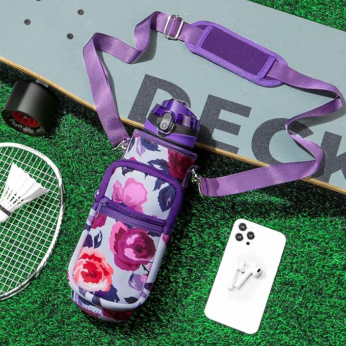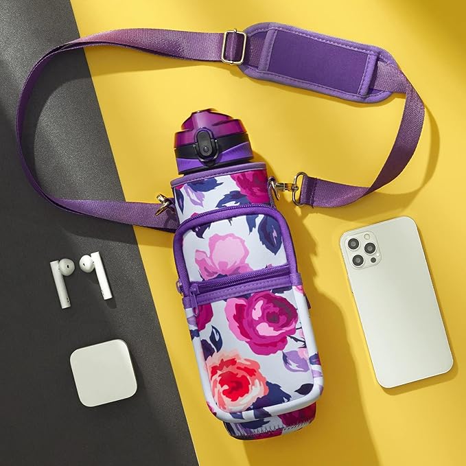- PORTABLE STORAGE SLEEVE: 32oz water bottle is designed with high quality 5mm Neoprene sleeve, which not only can protect the water jug from slight bumps and scratch, but also keep water cold 2-3 hours(water bottle is not insulated) and avoid condensation. 2 zipper pockets are designed for carrying your phone, cards, airpods, keys etc. Comes with an adjustable & removable padded shoulder strap, which can be adjusted from 25" to 50", offers, women, men more carrying options and hands free.