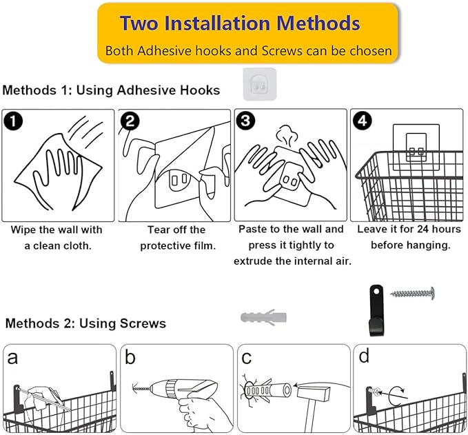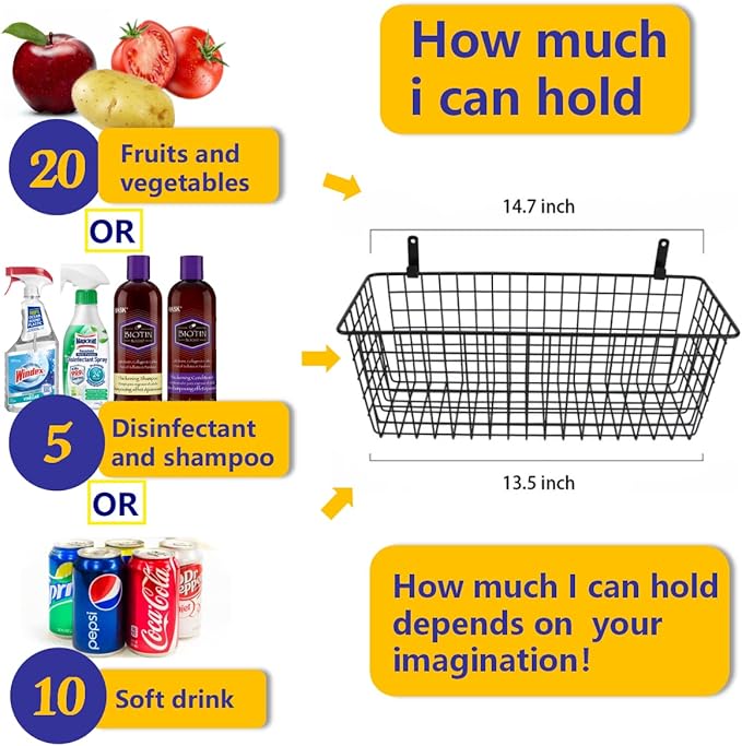 - đăMake good use of the remaining wallăcan be used on any wall in the home, such as storage rooms, kitchens, bathrooms, bedrooms, RV, courtyards, doorways, garages, offices, etc. These wall hanging baskets can support various items without being bent by weight, such as fruits, vegetables, snacks, spice jars, books, folders, magazines, bathroom accessories, toiletries, tools, etc.