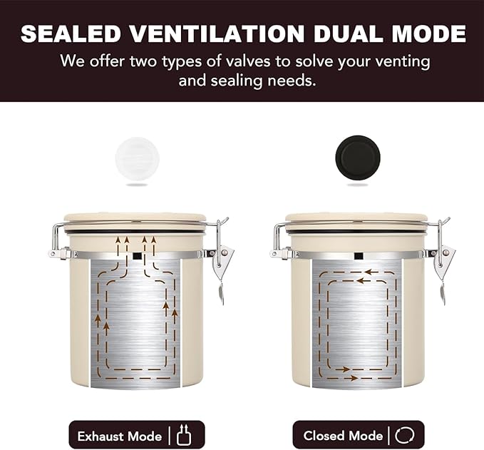 - 【TWO EXHAUST MODES】The canister features a CO₂ valve system and a silicone seal to lock in freshness and keep out moisture and air. A silicone gasket around the edge of the lid ensures an airtight seal when the lid is closed. Storing your coffee beans in this well-designed canister helps extend their freshness and ensures that every cup, even weeks later, tastes as good as the first.