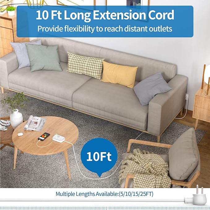 - 【 10 ft Flat Extension Cord with Flat Plug 】The flat extension cord 10 feet gives you the flexibility to reach distant outlets and hard-to-reach places. A perfect solution for when power outlets are not conveniently located nearby. 45°angled plug doesn’t block the bottom receptacle. The flat plug features a low profile fits easily in tight spaces like behind furniture, bookshelves, desks.