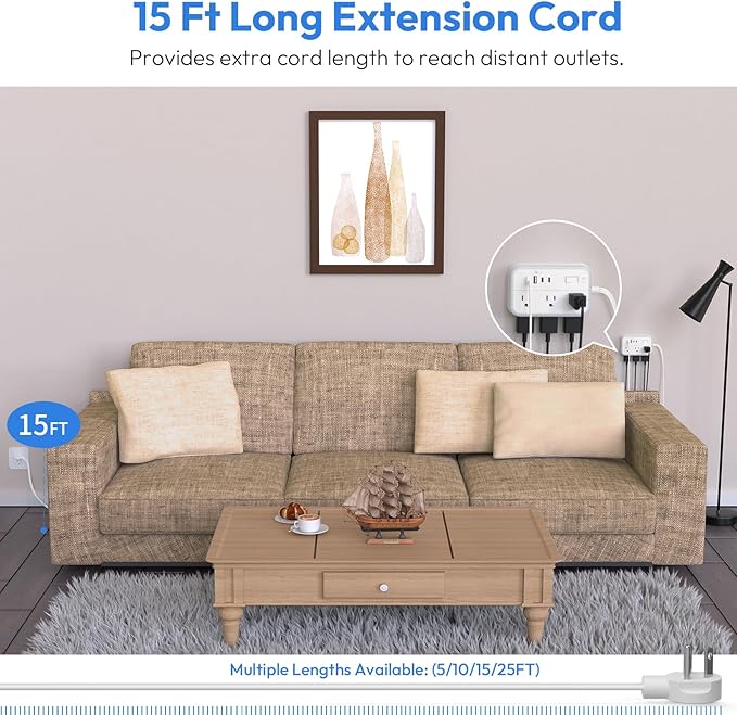 - 【 Extra Long Extension Cord with Flat Plug 】This flat plug extension cord 15 feet gives you the flexibility to reach distant outlets and hard-to-reach places. A perfect solution for when power outlets are not conveniently located nearby. 45°angled plug doesn’t block the bottom receptacle. The flat plug features a low profile fits easily in tight spaces like behind furniture, bookshelves, desks.
