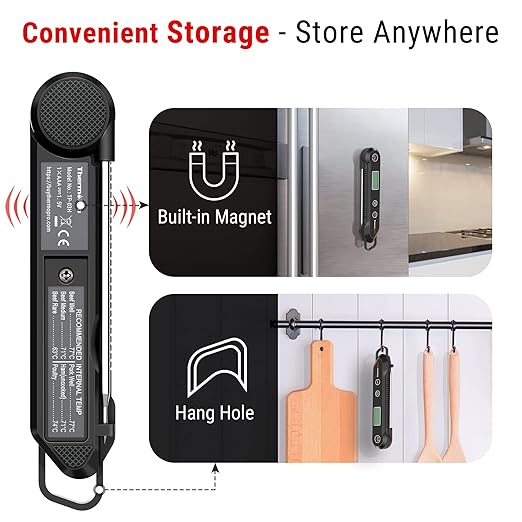 - Lock function: Kitchen thermometer can lock the current temp when the probe is removed from food and keep the temp displayed, no more dangerously peering into the oven or grill