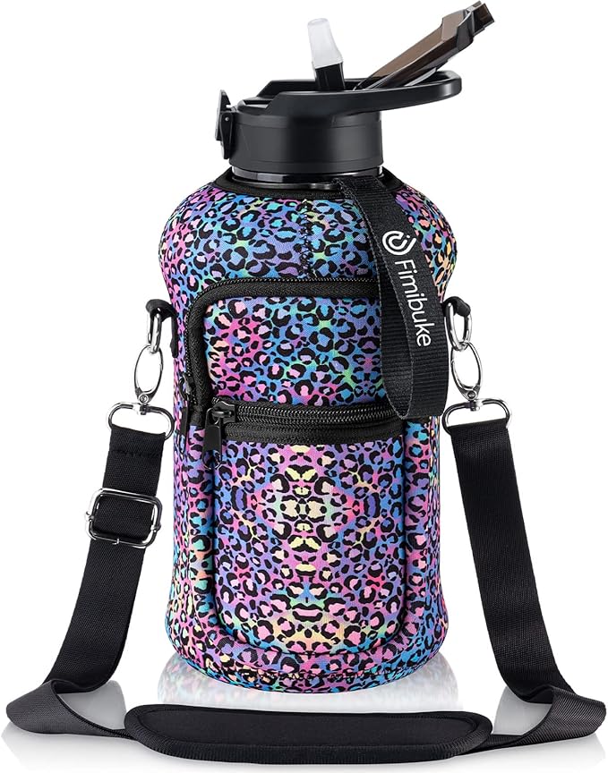 - INSULATED STORAGE SLEEVE: Our water bottle is designed with a high quality 5mm Neoprene sleeve, which not only can protect the water jug from slight bumps, but also keep water cold longer(water bottle is not insulated) and absorb messy sweat to avoid dripping on the table or seat. 2 zipper pocket is designed for storing your phone, card, airpods, etc. Comes with a adjustable & removable padded shoulder strap that can be adjusted from 25" to 50" to offer you more carrying options and hands free.