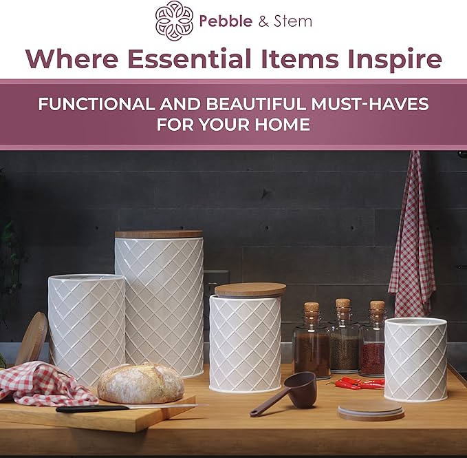 Pebble & Stem® White Metal Canister Set for the Kitchen Counter, Food Canister Set of 4, Airtight Lids, Sugar and Flour Containers for Countertops, Coffee and Tea Storage, Farmhouse Decor
