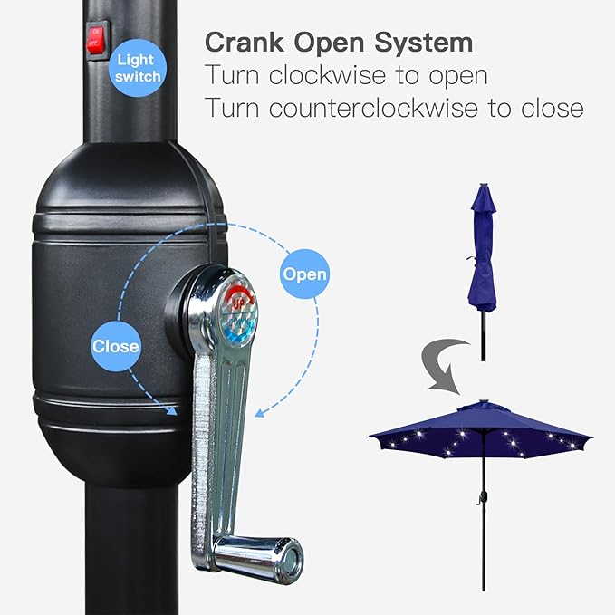 - Convenient crank opens/closes system and handy push button tilt, even easy to use for kids and the elderly. Keep the sun at the back in the daytime.