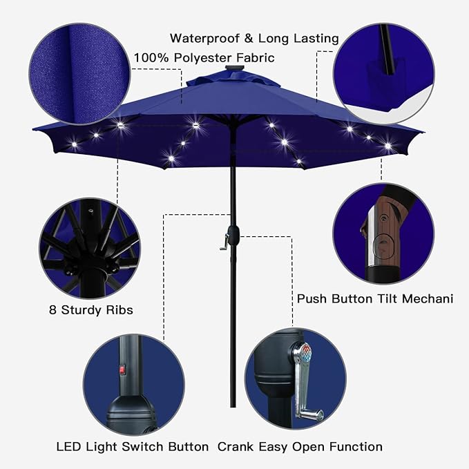 Sunnyglade 9' Solar LED Lighted Patio Umbrella with 8 Ribs/Tilt Adjustment and Crank Lift System (Navy Blue)