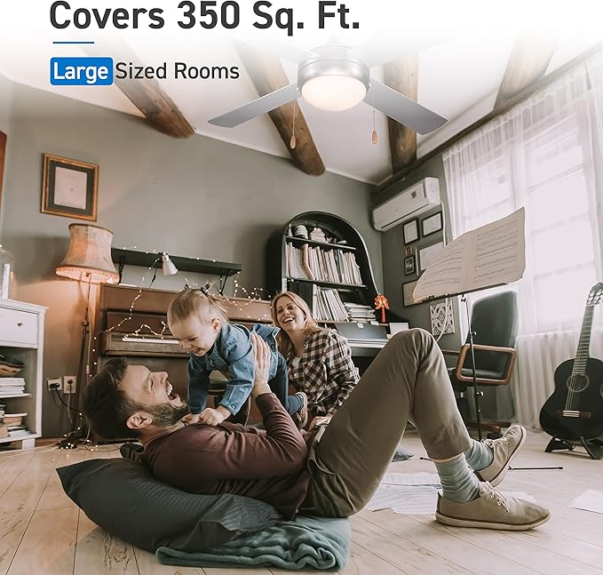 - COVERS 175 SQUARE FEET: This modern ceiling fan with lights ensures cool and breezy air in rooms up to 350 sq. ft. Perfect for larger-sized living rooms, master bedrooms and kitchens. Enjoy a quiet motor that creates breezy air without excess noise.