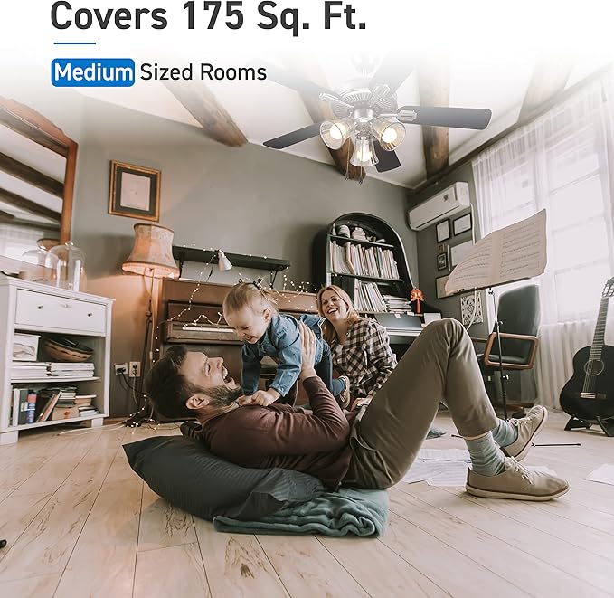- COVERS 175 SQUARE FEET: This contemporary ceiling fan with lights ensures cool and breezy air in rooms up to 175 sq. ft. Perfect for medium-sized living rooms, bedrooms and kitchens. Enjoy a quiet motor that creates breezy air without excess noise.