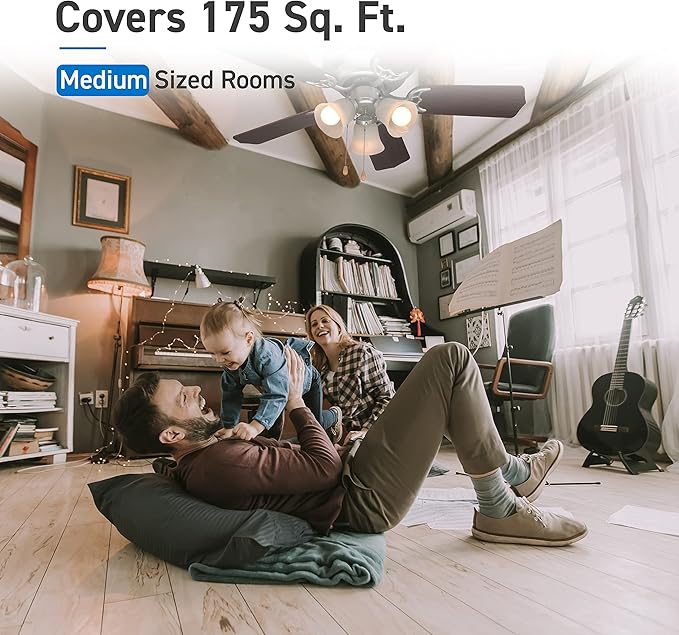 - COVERS 175 SQUARE FEET: This contemporary ceiling fan with light (14.5 lbs.) ensures cool and breezy air in rooms up to 175 sq. ft. Perfect for medium-sized living rooms, bedrooms and kitchens. Enjoy a quiet motor that facilitates breezy air without excess noise.