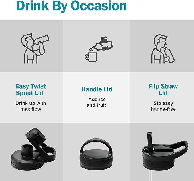 - 3 Caps Pack, 100% Leak-proof: Handle lid provides great portability; spout lid allows you to chug to instantly quench thirst; straw lid is for sipping when your hands are occupied elsewhere. They are all 100% leakproof no matter how it's positioned / used.