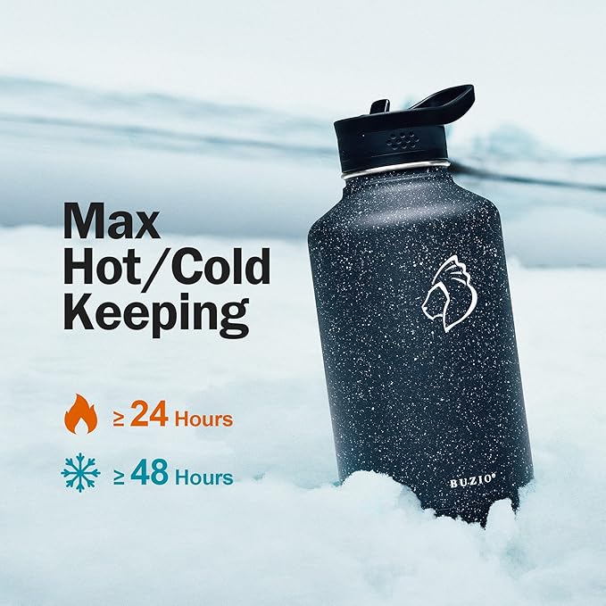 - Vacuum Insulated Water Bottle: Made of double wall 18/8 food-grade stainless steel, BUZIO ThermoArmour water bottle keeps liquids icy for up to 48 hours or hot for up to 24 hours.