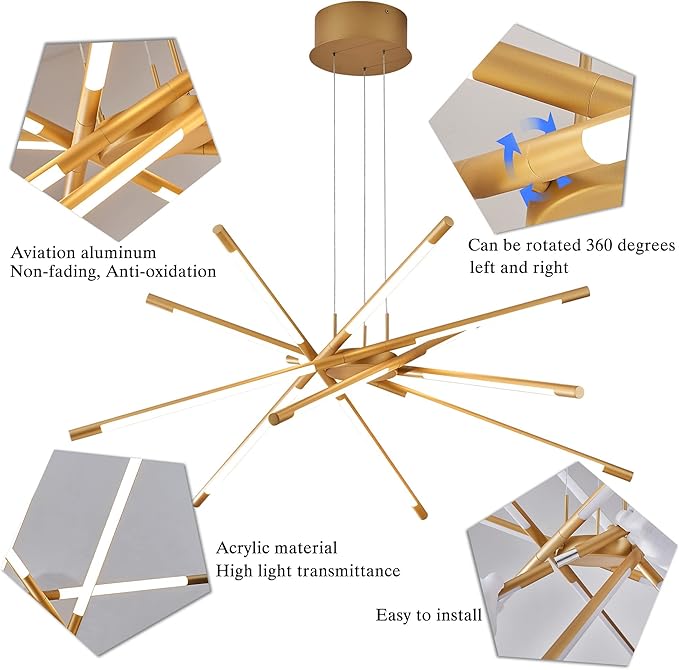 - Modern gold metal and acrylic chandelier with 12 integrated LED light sources for soft, glare-free lighting