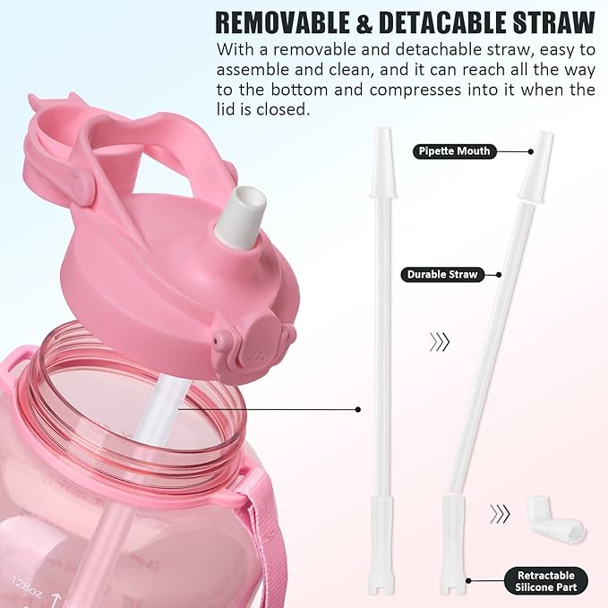 - HUMANIZED DESIGNS: Designed with time marker & inspirational quotes, Fimibuke water jug is great for helping you stay hydrated. Equipped with removable straw, you can enjoy spill-proof sipping with straw or fast water flow with spout. With one-click button on lid, you can open the lid with one hand by pressing the button. Wide-opening design makes it easy to fill with ice cubes and fruits, and easy to clean. The lid of the cup can be pulled to 180° to prevent pressing your nose when drinking.