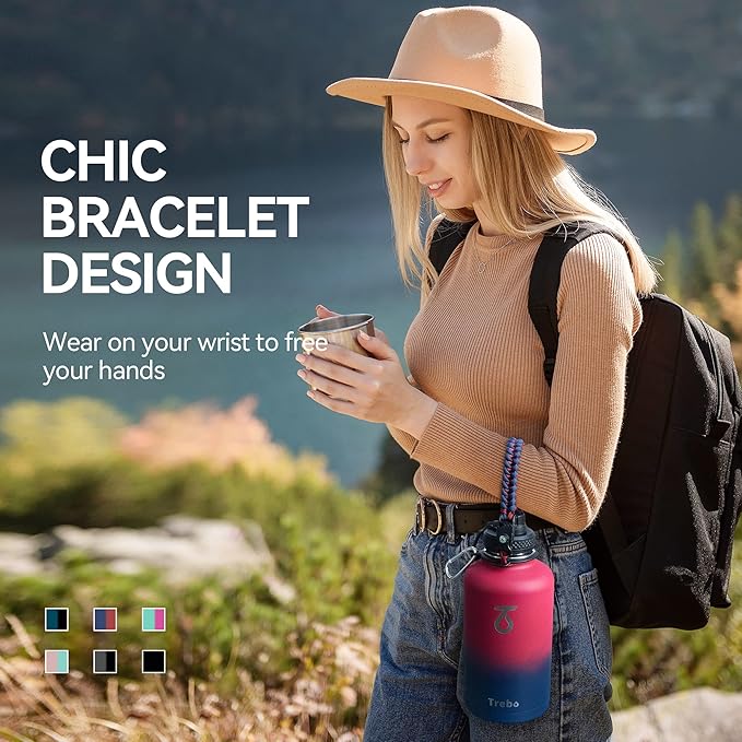 Trebo Half Gallon Water Bottle with Paracord Handle 64oz Wide Mouth Insulated Double Wall Stainless Steel Large Sports Flask Keep Hot 24 Hours & Cold 48 Hours Water Jug with 3 Lids Ombre: Ruby Red