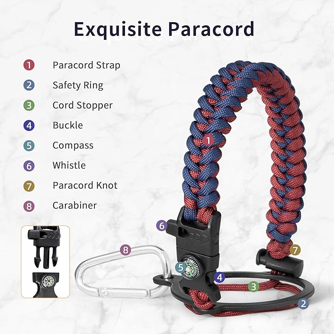 - Full-function Paracord: Brilliant paracord of matching colors bring out the bottle with a touch of youthful vibe. Compact compass and handy carabiner make the bottle the ideal survival kit for expeditions in the wild.