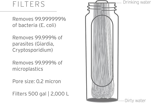 - Protects against 99.999999% of bacteria (including E.coli, Salmonella), 99.999% of parasites (including Giardia and Cryptosporidium), 99.999% of microplastics, silt, sand, and cloudiness
