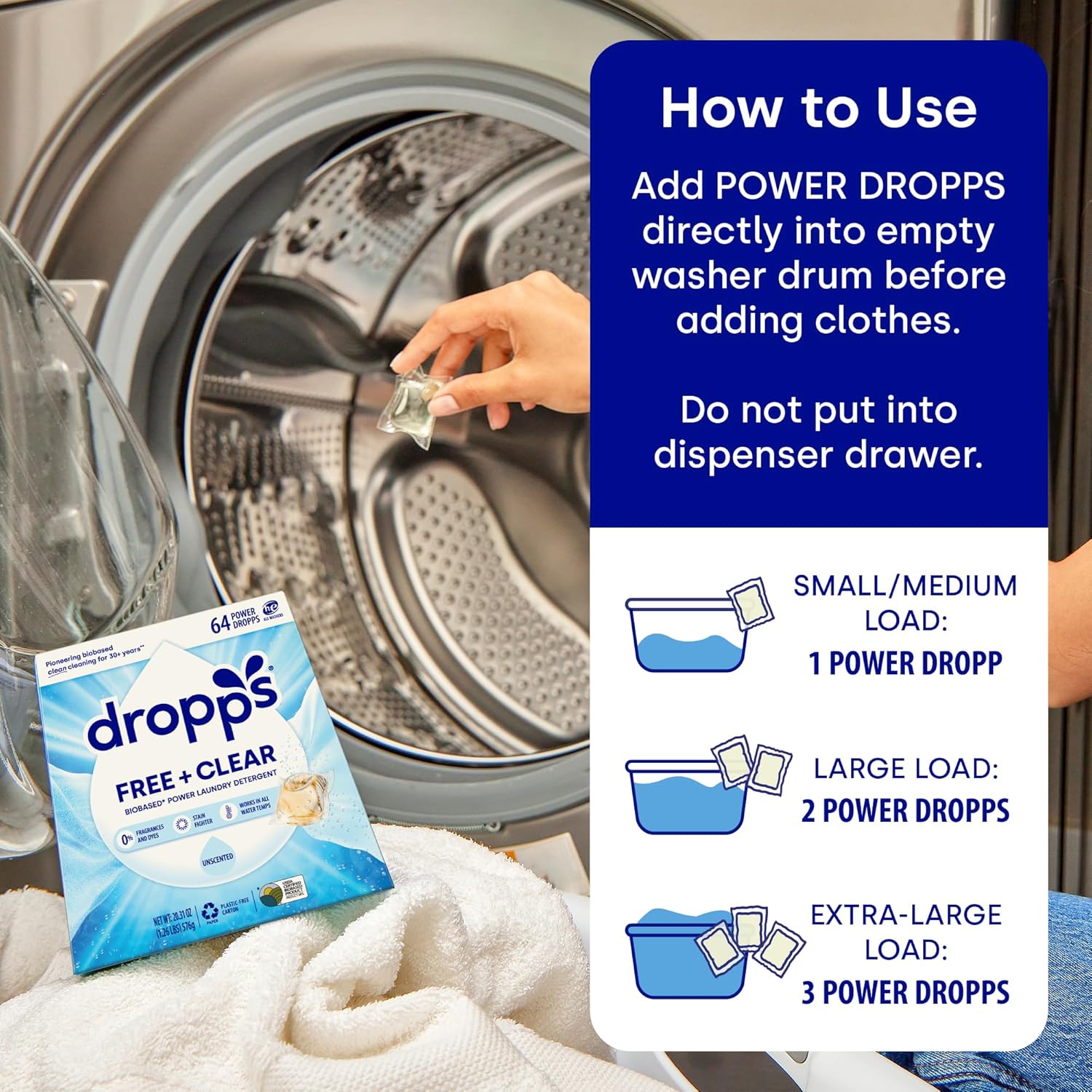 - EFFORTLESS CLEANING POWER: Get your laundry exceptionally clean with Dropps Free + Clear Laundry Detergent Pods. These Power Dropps are specially formulated to lift away stubborn stains and neutralize odors effectively, providing a thorough clean with each wash. Compatible with all washers (HE + standard), wash cycles, and temperatures. Unscented. 64 Power Dropps.