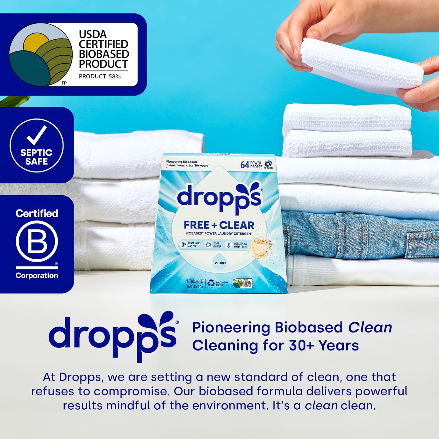 - ABOUT DROPPS: For over 30 years, Dropps has pioneered a cleaner clean – without compromise. As a B -Corp and trusted leader in household cleaning, Dropps delivers cutting-edge cleaning power in revolutionary liquid laundry and powder dish pods. Manufactured in North America. Leaping Bunny Certified.