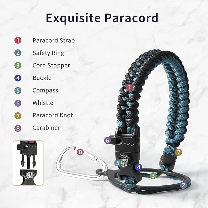 - Full-function Paracord: Brilliant paracord of matching colors bring out the bottle with a touch of youthful vibe. Compact compass and handy carabiner make the bottle the ideal survival kit for expeditions in the wild.