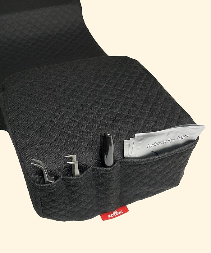 Pillow for Eyelash Extensions - Curved Memory Foam Lash Bed Pillow with Neck and Back Support, Perfect Pillow for Eyelash Extensions, Two Pockets for Tools On The Sides of Pillow (Black)