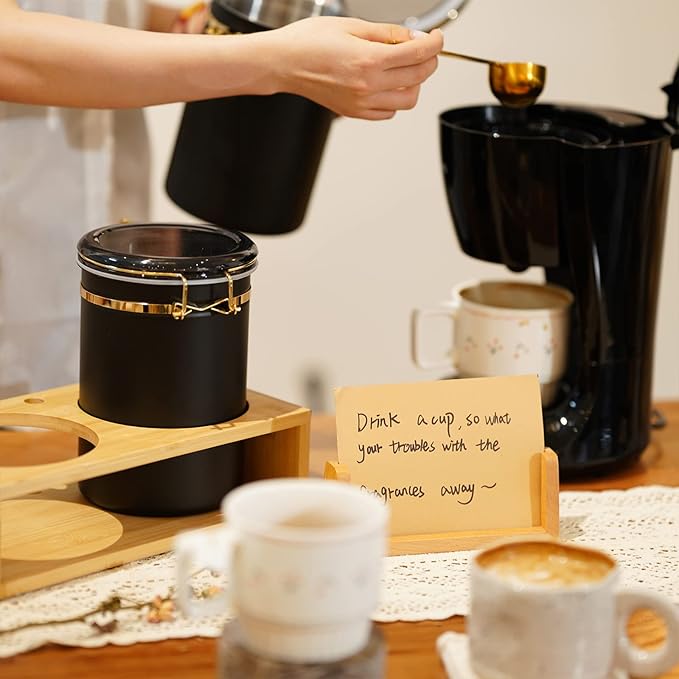 - KEEP THE DESKTOP TIDY: The coffee Containers set includes a wooden storage shelf and a Gold iron coffee spoon, which not only facilitates users to organize and categorize similar foods, make the desktop more tidy, and use the cans more conveniently, but also can decorate your desktop and let Your desktop is no longer monotonous.