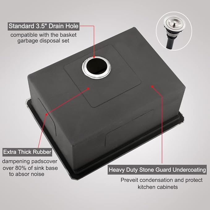 - Superior Features: This stainless steel undermount kitchen sink has extra thick rubber dampening pads to minimize noise and heavy duty stone guard undercoating to prevent condensation and protect kitchen cabinets. The R10 Tight Radius round corners for easy cleaning