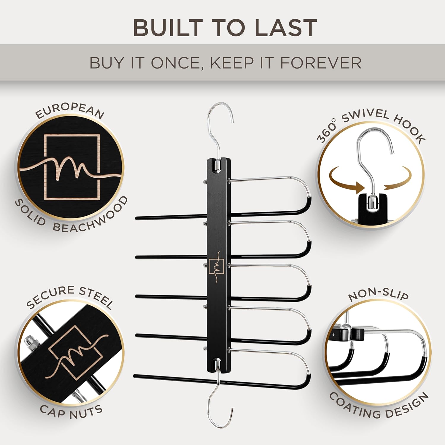 MORALVE Pants Hangers Space Saving - 2 Pack European Beechwood Scarf and Jean Hangers - Closet Organizer and Space Saver Pant Rack, Leggings Hanger, and Scarf Holder with 360° Swivel Hook