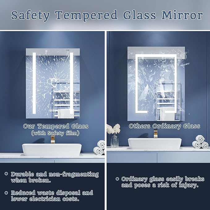 - 【Enhanced Defogging & Safety Protection】Experience clearer reflections with our newly upgraded medicine cabinet defogging technology. The mirror surface quickly warms to around 40°C, achieving a faster and safer defogging effect within minutes. For added safety, the defogging function automatically shuts off after 60 minutes or when the light is turned off, ensuring peace of mind. Built with an IP44-rated waterproof aluminum frame, this LED medicine cabinet delivers lasting durability and reliable protection in your bathroom.