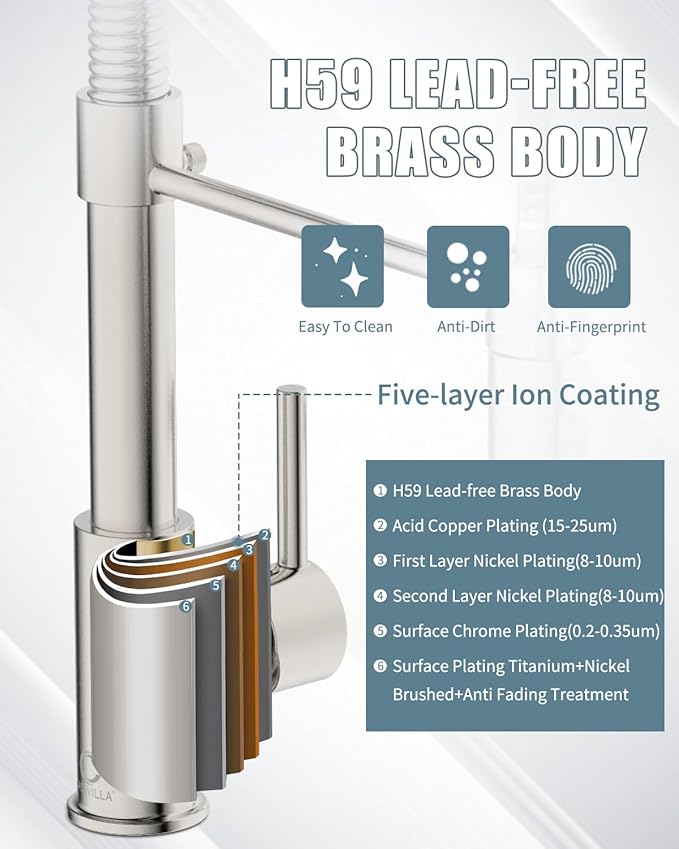 - 【EASY MAINTENANCE】Lead-free solid brass body and commercial SUS 304 stainless steel spring construction forged products. Nickel Brushed surface treatment added 18/8 Chromium/Nickel content provides a superior anti-corrosion and anti-rust finish that prevents dirt such as fingerprints or water stains from adhering to the faucet surface, making the kitchen look cleaner. Daily cleaning with a cloth or water is enough, less time cleaning and more time having fun with your family.