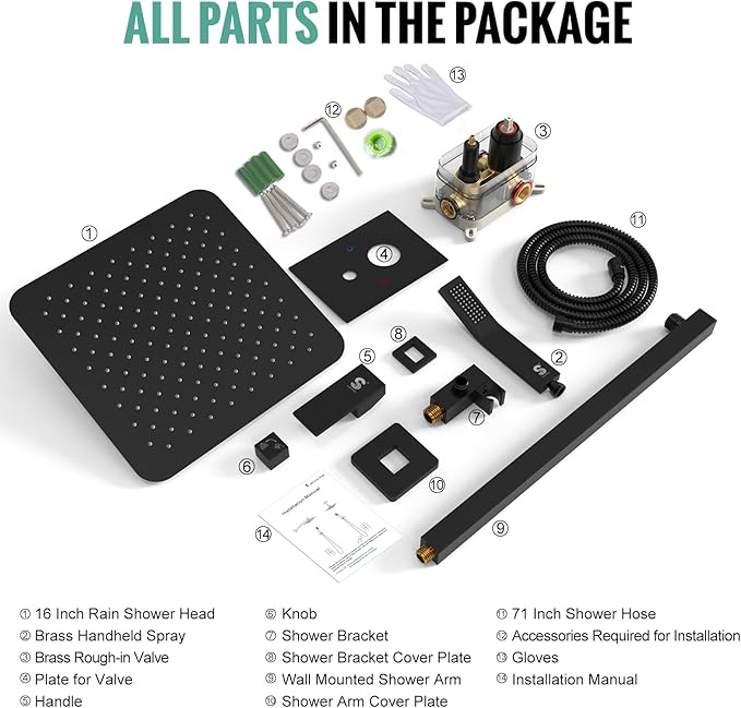 - Complete Shower System Included: This shower faucet set includes everything you need for a luxurious upgrade: a 16-inch rain shower head, a handheld shower head, a 71-inch shower hose, a 16-inch shower arm, a handheld bracket, a mixing valve, a panel, a handle, a mode knob, shower arm and bracket covers, and all necessary installation accessories.