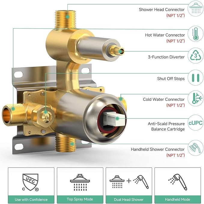 - Prevent Water Hammer: This pressure balance valve has built-in Shut Off Stops to effectively prevent water hammer noise and control the water pressure. Pressure balance valve's cartridge monitors water pressure balance, helping to protect you from being scalded by sudden changes in hot or cold water pressure.