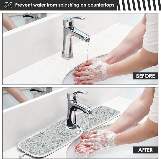 - DECORATION FOR KITCHEN BATHROOM: Using these Faucet Splash Catchers with our unique design, timeless color and seamlessly blends into your home to create perfect Sink Accessories, add a touch of luxury in your kitchen&bathroom will give your house an amazing makeover and elevate your home decor.