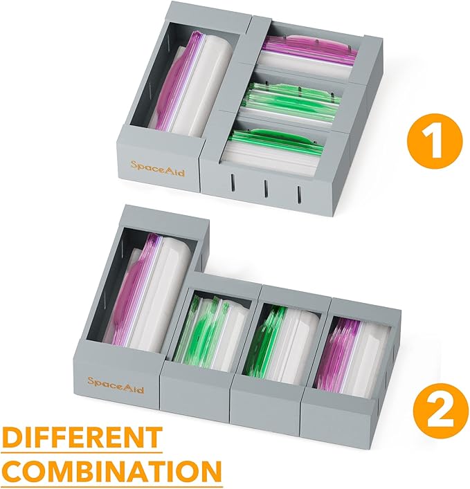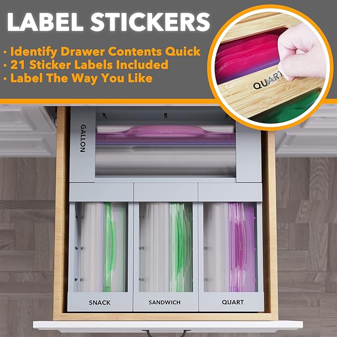 - No Assembling Needed: Our gray bamboo organizer box comes fully assembled easy to use; Size: 12 x 5 x 3 inches (1 pcs) for Gallon, 8.7 x 4 x 3 inches (3 pcs) for Sandwich, Quart & Snack; USPTO Patent Pending