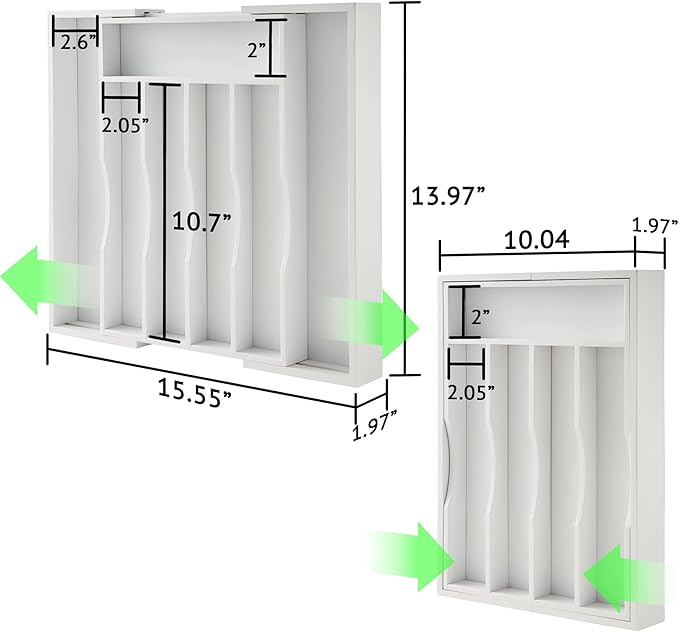 - [TWO-PIECE SET]: This 2-Piece 10.04" - 15.5" wide, 13.98" long and 1.97" deep bamboo drawer organizer can tame your out-of-control kitchen drawers, to store and organize the cutlery and kitchen utensils according to your rules, and maximize the drawer storage. Keep everything accessible and organized, so that you don't have to rifle around for your cooking tools. Beautiful and practical kitchen drawer organizer turns the cooking and tasting into things of beauty and efficiency.