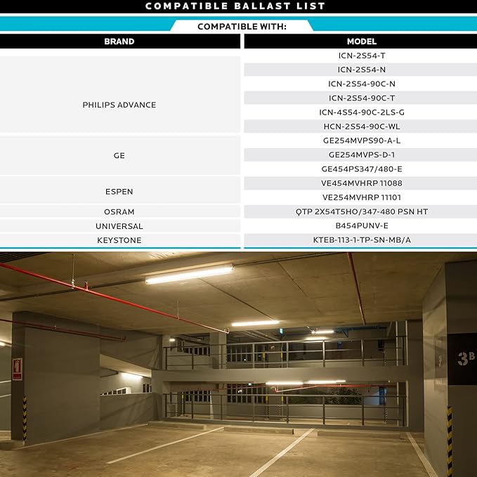 - High Brightness & Efficiency – Each 4-foot LED tube delivers 3000 lumens of 4000K cool white light at 24–54W, achieving an efficiency of 125 lm/W. Ideal for use in garages, workshops, offices, basements, and utility rooms as a direct replacement for 48-inch fluorescent tubes.