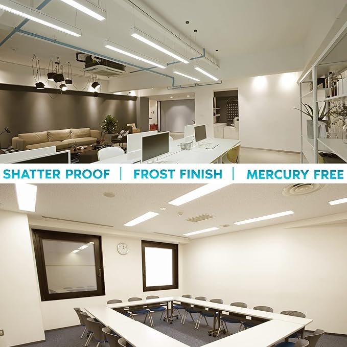 - High Brightness & Efficiency – Each 4-foot LED tube delivers 3000 lumens of 4000K cool white light at 24–54W, achieving an efficiency of 125 lm/W. Ideal for use in garages, workshops, offices, basements, and utility rooms as a direct replacement for 48-inch fluorescent tubes.