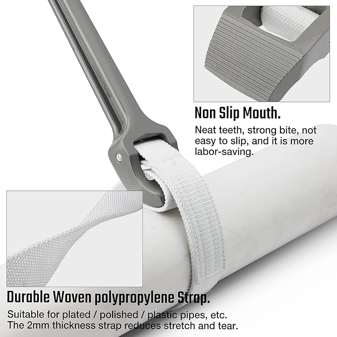 - The 2-ply double thick strap reduces stretching and tearing, the nylon belt wrench has a non-slip design on the head, and the nylon belt is made of high-quality, long lasting composite material for improved efficiency