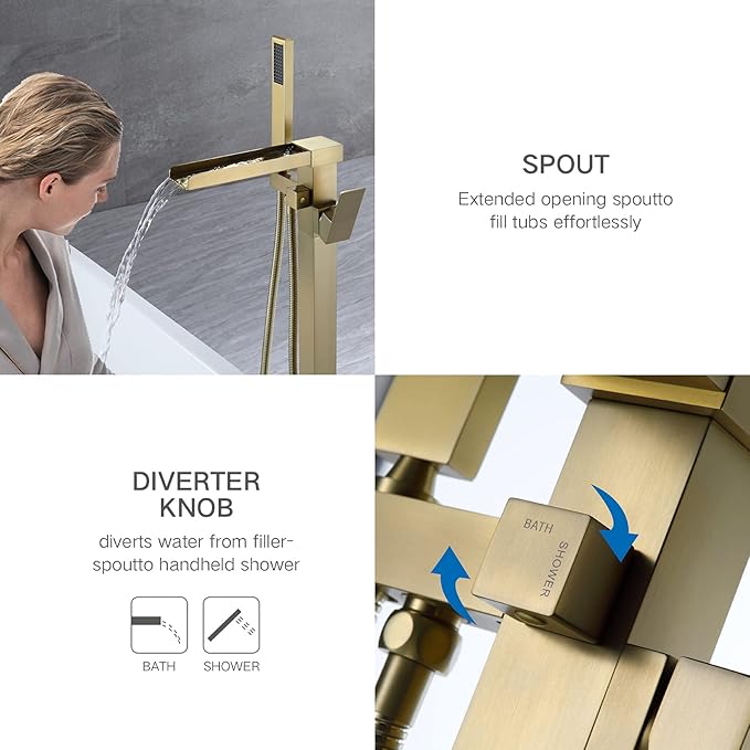 TapLong Freestanding Tub Faucet๏ผWaterfall Tub Filler Freestanding Bathtub Faucet Brushed Gold Single Handle Stand Alone Brass Bathtub Faucet with Hand Held Shower, 51001ZBGG