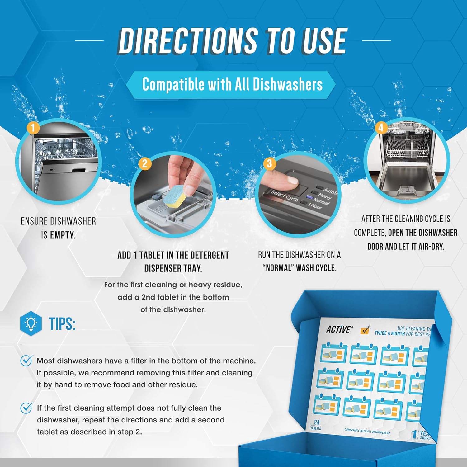 - Monthly Maintenance Solution - Keep your dishwasher and washer cleaned with ACTIVE cleaning supplies. Use single or 2 treatment tabs per month. Place pod inside empty machine, run a self clean or regular cycle to restore your machine.
