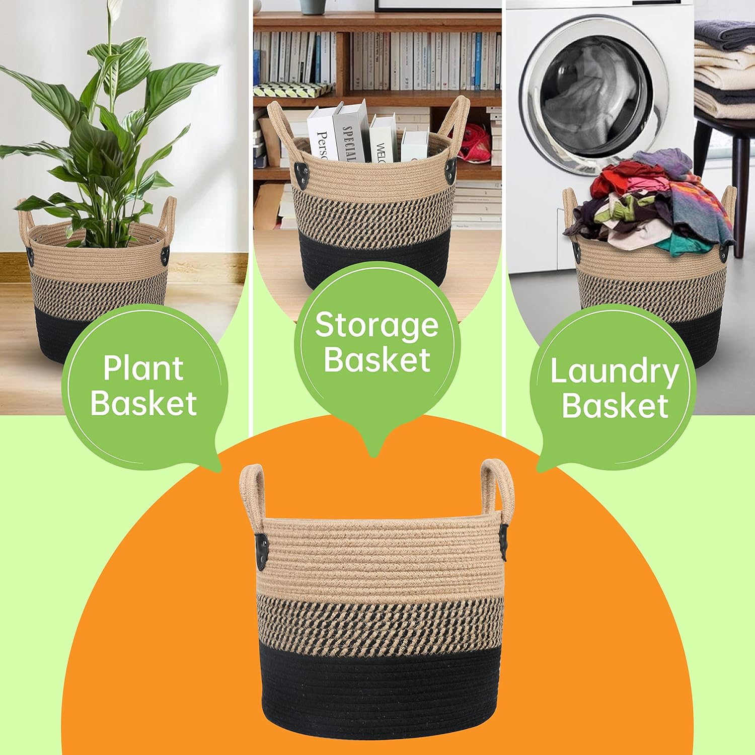 14"x12" Natural Jute Rope Woven Storage Basket with Handles for Plant, Blankets,Toys - Living Room Home Decor,Multifunctional Basket for Organizer,Picnic,Artificial Tree Black and Beige