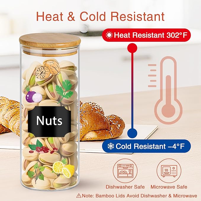 - 【Airtight &Moistureproof 】These food storage jars utilize precision bamboo lid with silicone rings to create an airtight seal. The moisture-proof glass storage jars with bamboo lids effectively block ants while preserving freshness in kitchen food jars & canisters.