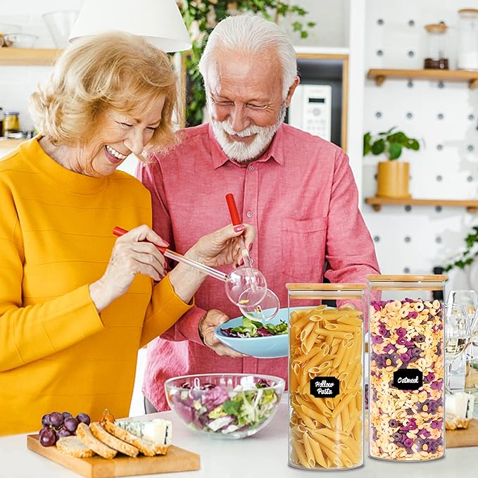 - 【Label & Stack System】Stay perfectly organized with 58 colorful labels included with these kitchen jars. The uniform glass pantry storage containers set with airtight bamboo lids stack neatly to maximize space - ideal for small kitchens storing flour, nuts or pet treats.