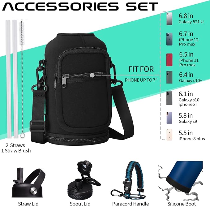 - SUPER JOYFUL COMBO: Buy a 64 oz insulated water bottle, get 9 accessories (2 x lids, 1 x survival paracord, 1 x carrying pouch, 1 x shoulder strap, 1 x protective cup mat, 2 x straws, 1 x straw brush). DIGJUPER provide a lifetime warranty and 7X24H customer service.