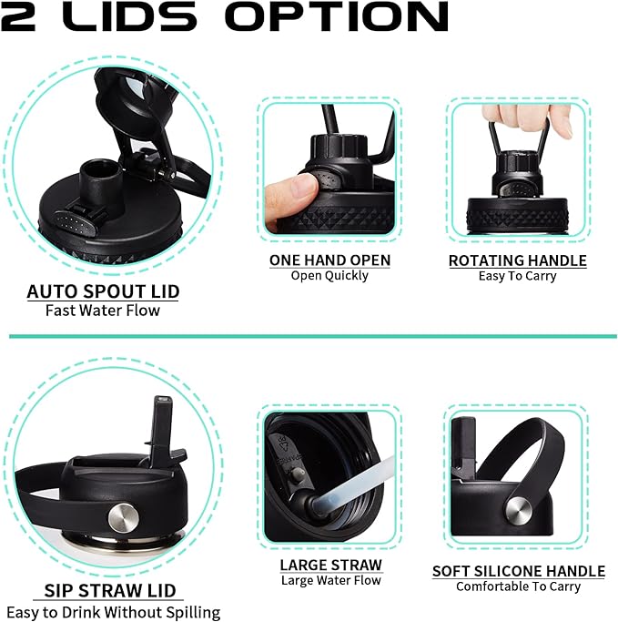 - 2 LIDS—100% Leak Proof: the auto spout cap & straw lid provide your different drinking experience. The ONE-HAND operation pop-up spout lid for convenient enjoy your fast water flow. The SPILL-PROOF straw lid with high flow rate & BPA free. Both 2 lids design with a sturdy handle, making the insulated water bottle more convenient to carry
