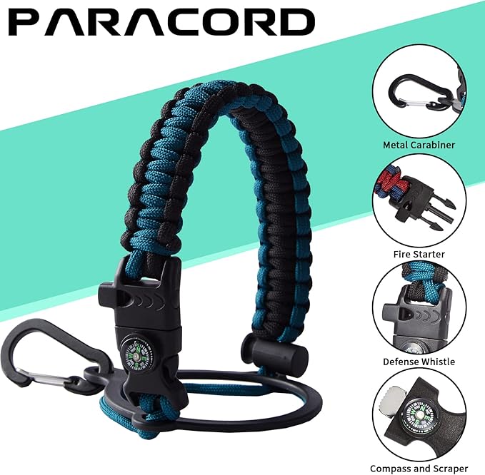 - UNIQUE PARACORD—Perfect Accessories: bright color paracord matches the flask water bottle to give you a youthful vibe while adding a personal style. It comes with a compass, safety loop, metal carabiner, flint, igniter, and whistle to become your survival tool for your wild adventures.