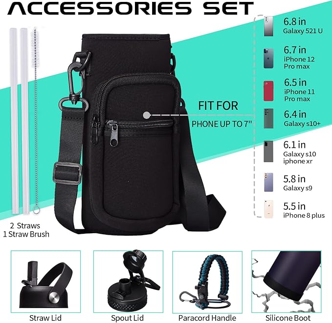 - COMBO—Super Deal: Buy 40oz stainless steel water bottles and get 9 accessories (2 x lids, 1 x survival paracord, 1 x carrying pouch, 1 x shoulder strap, 1 x protective cup mat, 2 x straws, 1 x straw brush). WITH A LIFETIME GUARANTEE, these thermal water bottles are the perfect gift for use at home, work, school, road trips, hiking, sporting events, or just hanging out