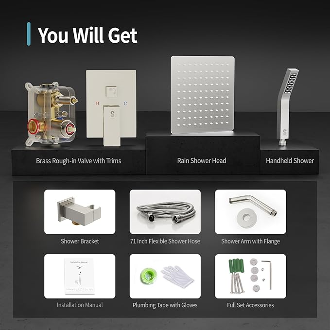- Complete Shower System Included: This shower faucet set includes everything you need for a luxurious upgrade: a 8-inch rain shower head, a handheld shower head, a 71-inch shower hose, a 16-inch shower arm, a handheld bracket, a mixing valve, a panel, a handle, a mode knob, shower arm and bracket covers, and all necessary installation accessories.