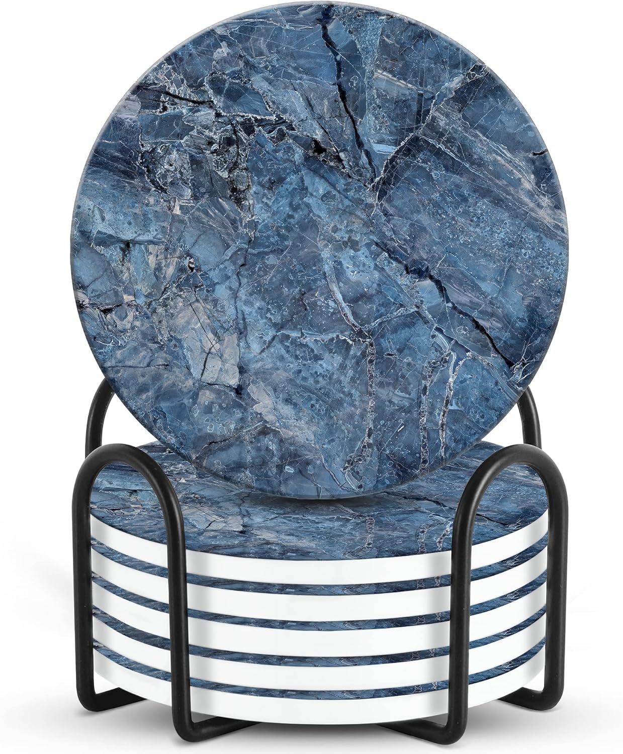 Emerson Coasters for Drinks Absorbent – Natural Stone Drink Coasters Set with Holder, Coasters for Coffee Table, Wooden Tabletop Protection Marble Style – 100% Heavy Duty Set of 6 (Mystic)